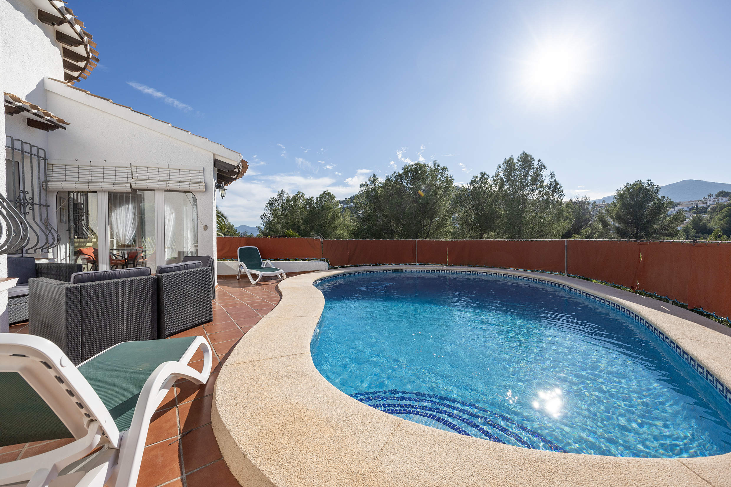 The bright living area includes a cozy fireplace and connects seamlessly to outdoor spaces, where a private garden and refreshing swimming pool await. Enjoy stunning views of the surrounding mountains while relaxing on the terrace.